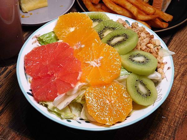 經典水果沙拉上面鋪滿 柳橙 葡萄柚與奇異果 ,旁邊搭配著麥片 ,下面有滿滿生菜與優格醬